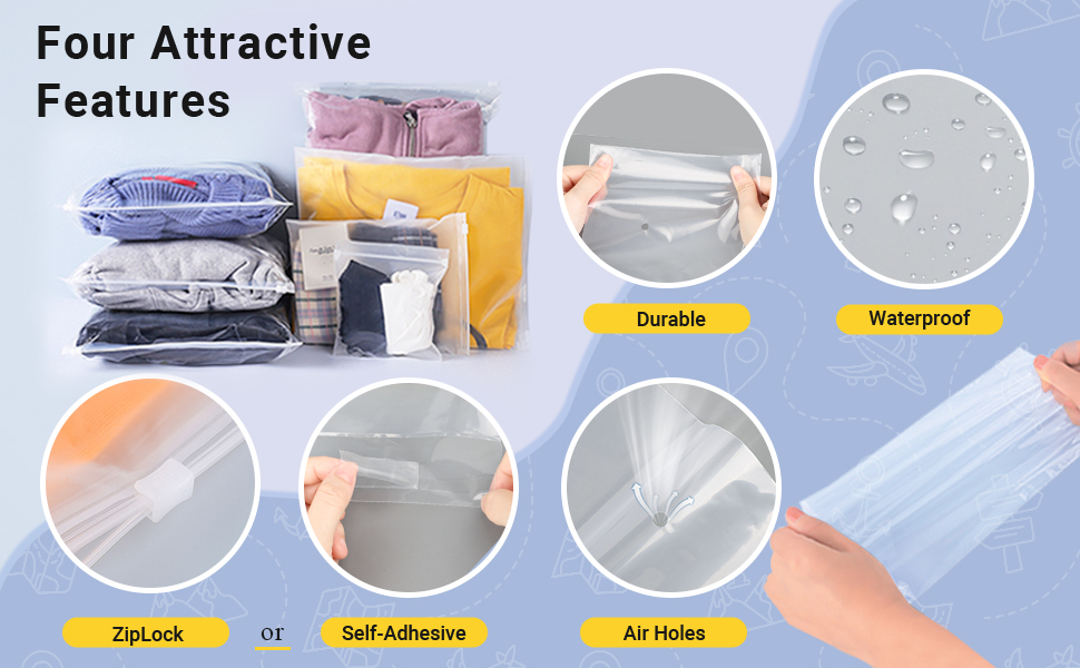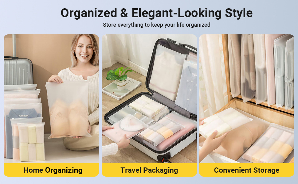 【Resealable Zipper】:Our resealable plastic zipper bags feature high-quality sliding zippers that seal automatically and easily, protecting your clothing and belongings from dust, odors, and moisture.